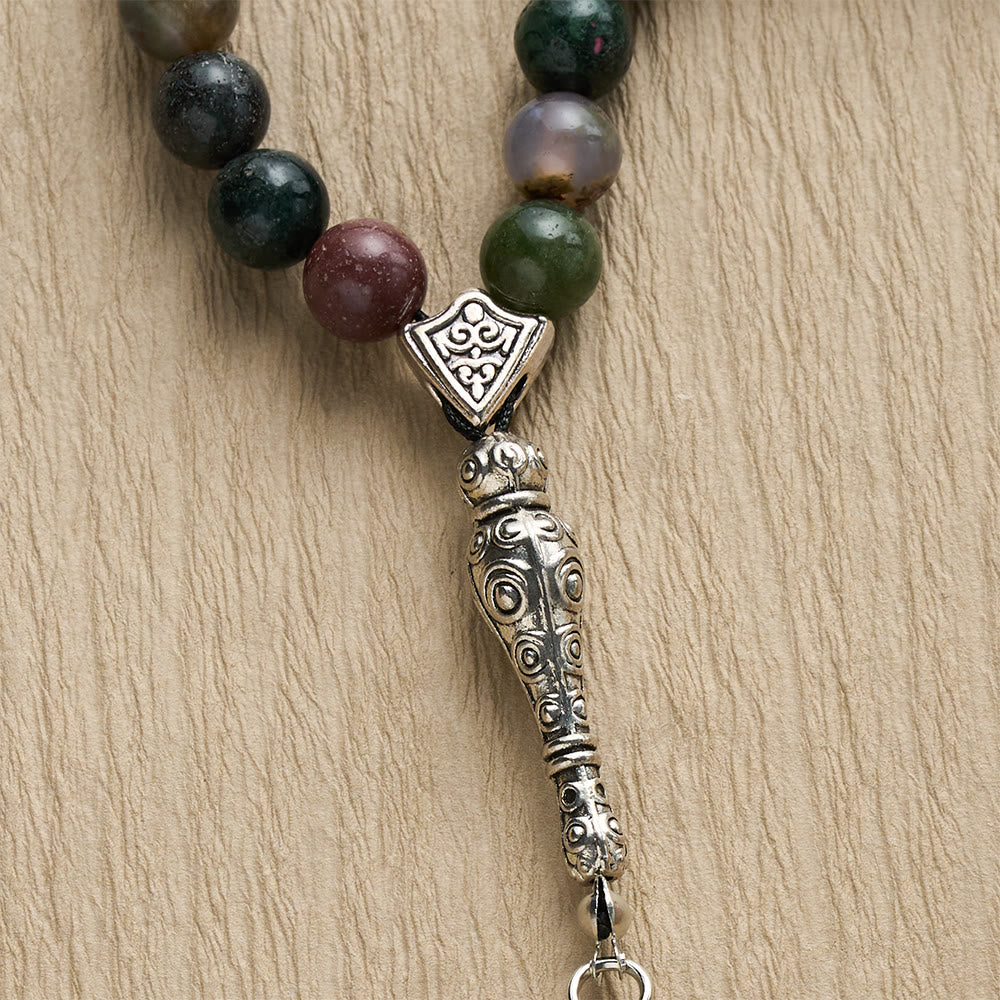 Elevate your daily ritual with this natural agate beaded strand, where timeless stone beauty meets thoughtful, cultural design. Made from premium-grade agate, this strand is durable, naturally smooth, and resistant to wear, making it perfect for everyday use and long-lasting enjoyment. Each of the 99 beads is carefully polished to a sleek, comfortable finish, ensuring a satisfying glide every time you hold it. The unique natural patterns add a one-of-a-kind touch, while the silver filigree tassels enhance its visual appeal and make handling effortless. Ideal for moments of focus, relaxation, or personal reflection, this strand complements both bohemian and classic aesthetics. Whether you treat yourself or gift it to someone special, this beaded strand is a beautiful blend of lasting quality, artisanal charm, and heartfelt appeal.