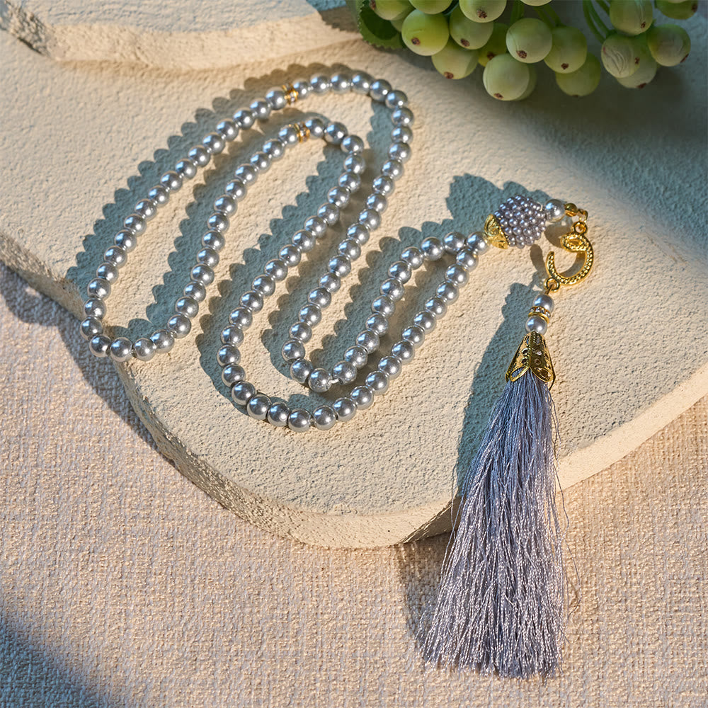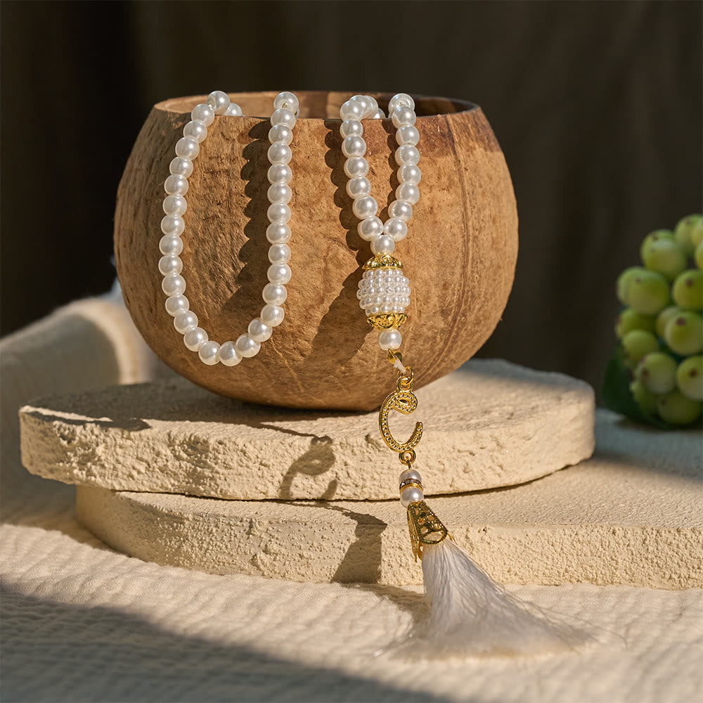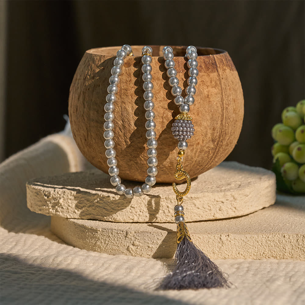 HilalHaven 6mm Round Faux Pearl Glass Tasbih with Tassel — Handcrafted Modern Minimalist Islamic Prayer Beads